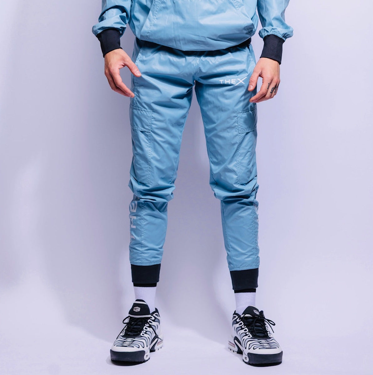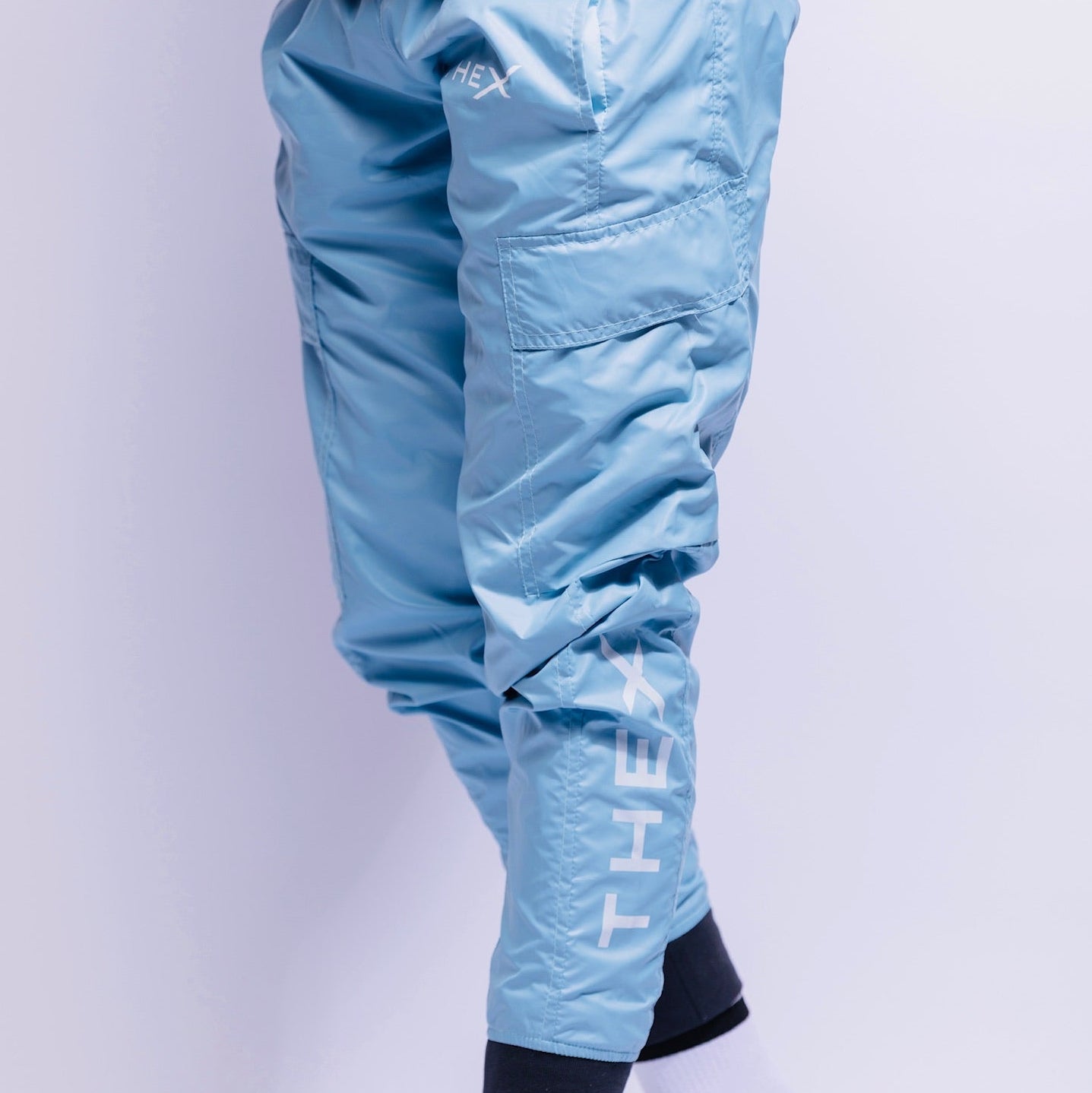 The black elastic waistband and cuffs frame the Ice Blue nylon with sharp contrast, holding shape while staying calm on the surface.