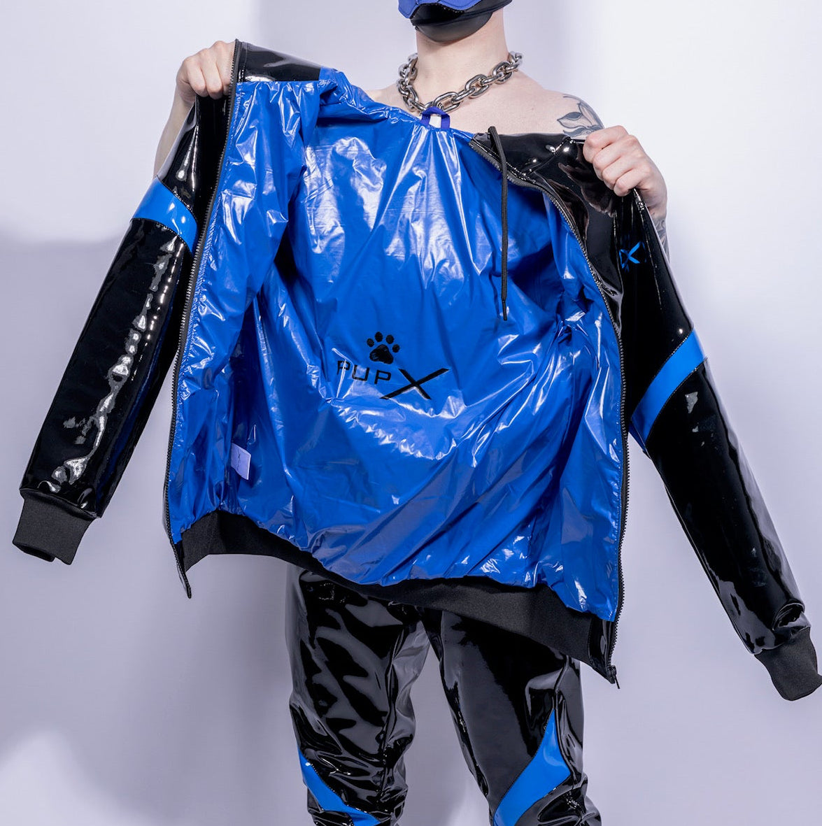 The BARK Jacket | BLACK/BLUE | PVC PRO locks your upper body into full fetish shine. Outside: ultra-glossy PVC PRO that reflects light like liquid. Inside: shiny blue NYLON that sticks to the skin and turns heat into energy.