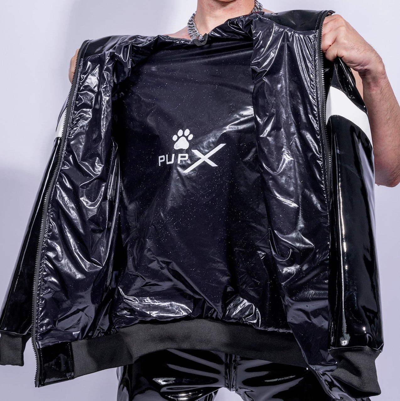 The BARK Jacket | BLACK/WHITE | PVC PRO locks your upper body into full fetish shine. Outside: ultra-glossy PVC PRO that reflects light like liquid. Inside: shiny black NYLON that sticks to the skin and turns heat into energy.