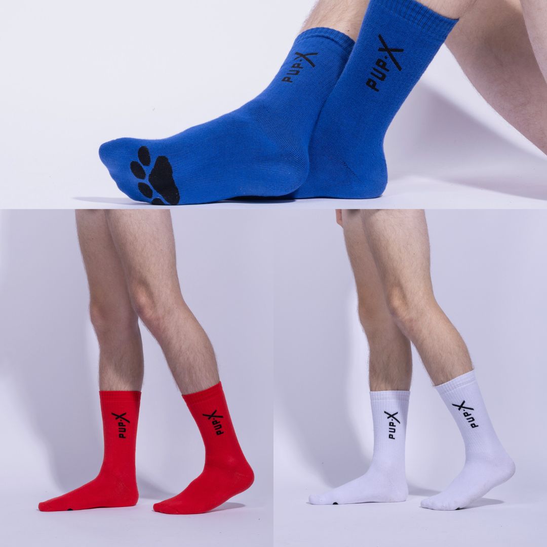 The BARK Socks | 3-Pack gives you all three signals: red, blue and white. Each pair is cut from premium cotton blend, thicker and softer than standard, made to hug your paws tight and last through wear, play and repeat.