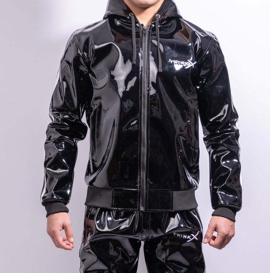 The black base is cut by sharp white lines — embedded into the material, slightly shifted toward the back.