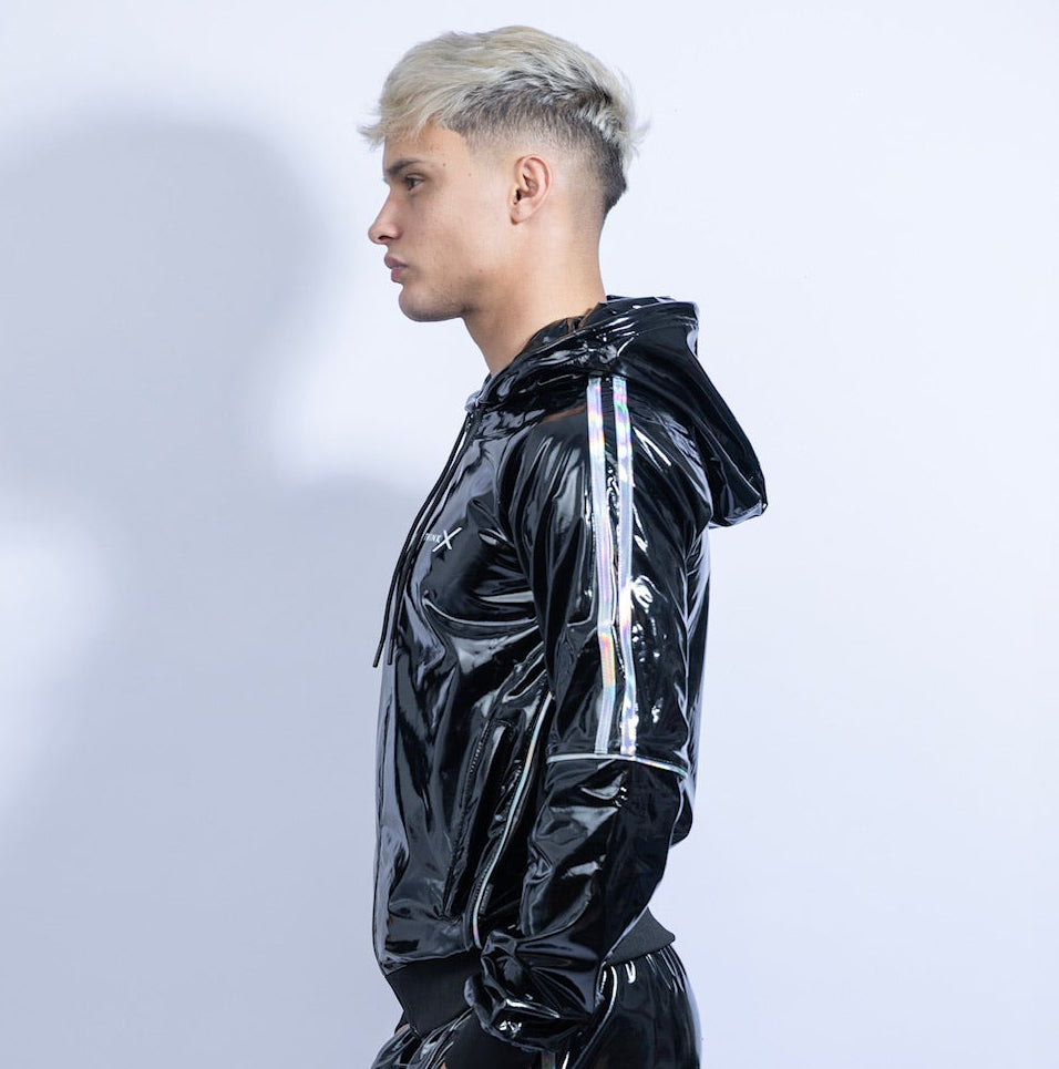 The SUPERHERO JACKET in BLACK/HOLOGRAPHIC mirrors the same iconic design — glossy black PVC combined with holographic silver details that shift color depending on light, movement, and angle. Calm in shadow. Explosive under light.
